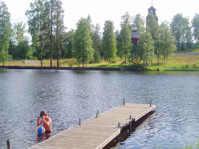 Bad i Lagforsdammen, brygga och omklädeshytt.
